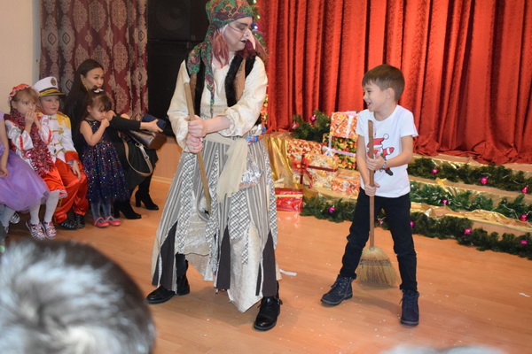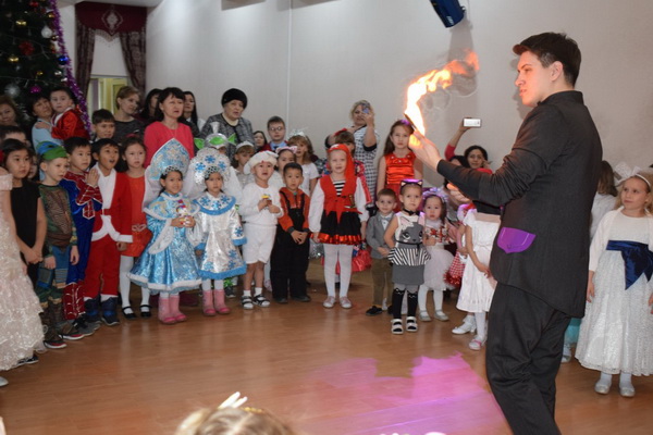 На утреннике для детей ожили персонажи старых добрых сказок — Баба-яга, болотная кикимора — Чуфындра, зайчик-попрыгайчик, Дед Мороз и Снегурочка. А также своими фокусами удивил Антон Вознесенский.