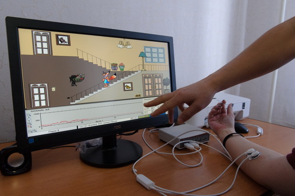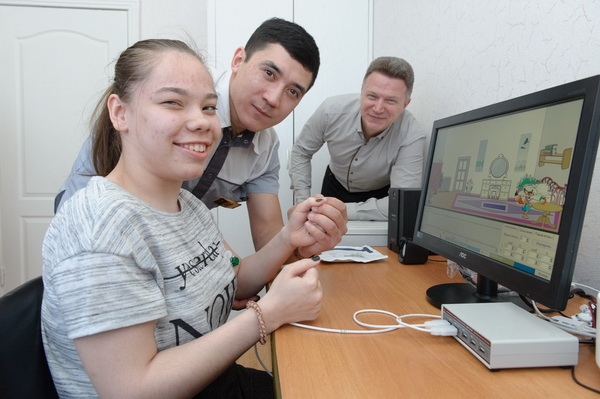 На руке у Насти Мустафиной датчики, они контролируют импульс, усилие, с которым девочка напрягает мышцу. С виду все просто – на экране монитора мультфильм, нужно, двигая рукой, заставить персонажа ходить, брать какие-то предметы, перемещаться по виртуальному пространству. В награду за пройденный уровень показывают мультфильм. На самом деле, тренировка идет на предельном усилии (его определяют датчики и фиксирует специальный прибор, который обеспечивает взаимосвязь пациента с компьютерной программой). Трудно. Левая рука у Насти работает плохо. Эти тренировки нужны для того, чтобы научить руку работать в полную силу. Все равно, что занятия в тренажерном зале. Только тренируется не столько мышечная сила, сколько умение мозга управлять организмом – именно оно у пациентов с ДЦП нарушено.