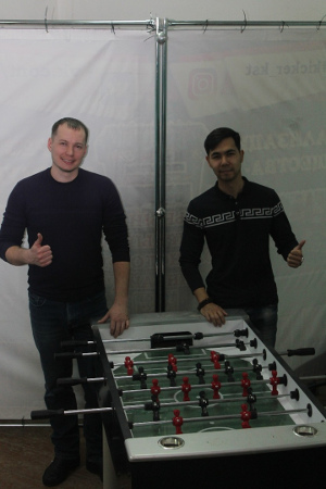 «Кикер-шоу» – проект Анатолия Балышева и Асета Байкасымова (на снимке). Ребята рассказывают, такой подобный досуг сейчас весьма популярен в России. В Казахстан этот вид развлечения, с помощью которого можно разнообразить, например, торжество, только приходит. Анатолий Балышев рассказывает, что в Европе сейчас популярны так называемые Welcome-зоны. Пока гости ожидают, к примеру, появления новобрачных, они могут разбиться на команды и поиграть в настольный футбол. Игра не только помогает коротать свободное время с удовольствием, она еще и сплачивает незнакомых или малознакомых между собой людей.