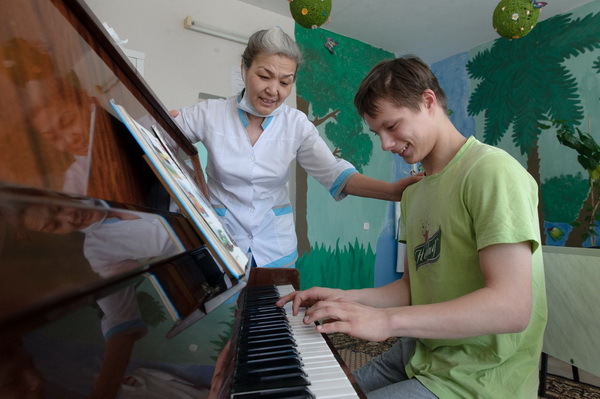 Отделению реабилитации при детской городской больнице в 2018-м исполняется четыре года. Заведует им Татьяна Костенко – врач-педиатр и удивительный человек, к которому как магнитом притягивает таких же удивительных людей. Недавно притянуло Раузу Токушеву – талантливого музыканта, певицу. Много лет она проработала в театре оперы и балета имени Абая в Алматы, по семейным обстоятельствам вынуждена была вернуться на родину. И уже много лет она не только поет, но и преподает. Работает с особенными детьми, с помощью музыки влияет на умение ребят-аутистов взаимодействовать с окружающим миром. А тем, кому интересна музыка, с удовольствием дает индивидуальные уроки. Мы как раз пришли во время такого. Руслан Конакбаев разучивал аккорды вальса. «Плавно, вот так! – поправляла его преподаватель. – В ритме биения сердца»…