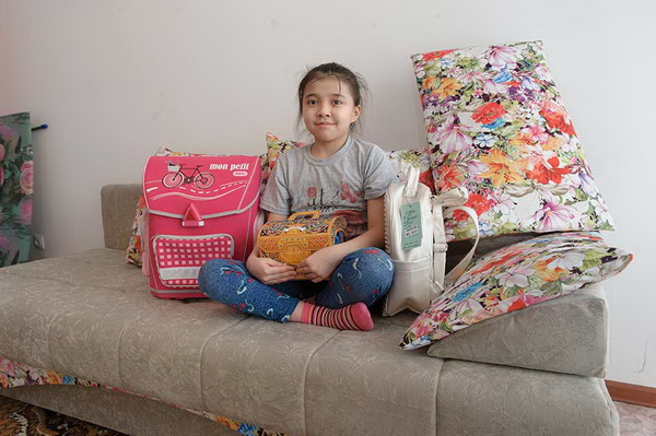 Для того чтобы доставить подарок Дарине Ембергеновой (тугоухость) тоже понадобилась большая машина. Девочка мечтала спать отдельно от мамы. Компания, пожелавшая остаться неизвестной, купила для Дарины классный диван. Оплатили даже доставку. А еще купили ранец – о нем девочка тоже мечтала. Принесла для нее ранец и куртку женщина, тоже попросившая не называть ее имени. Все доставлено! Теперь у Дарины один диван и даже два ранца.
